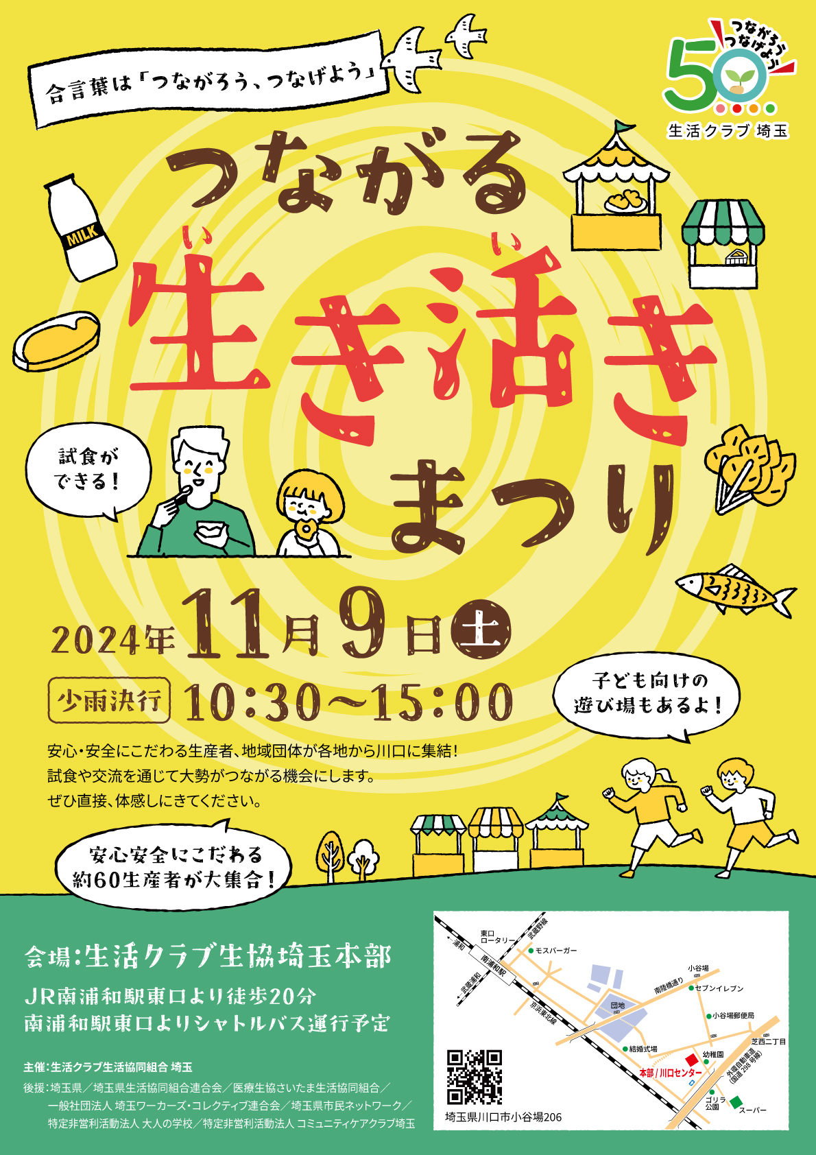 生活クラブ埼玉50周年「つながる生き活きまつり」が開催されます! 試食をたくさん展開しています。ぜひお友だちを誘ってお越しください。