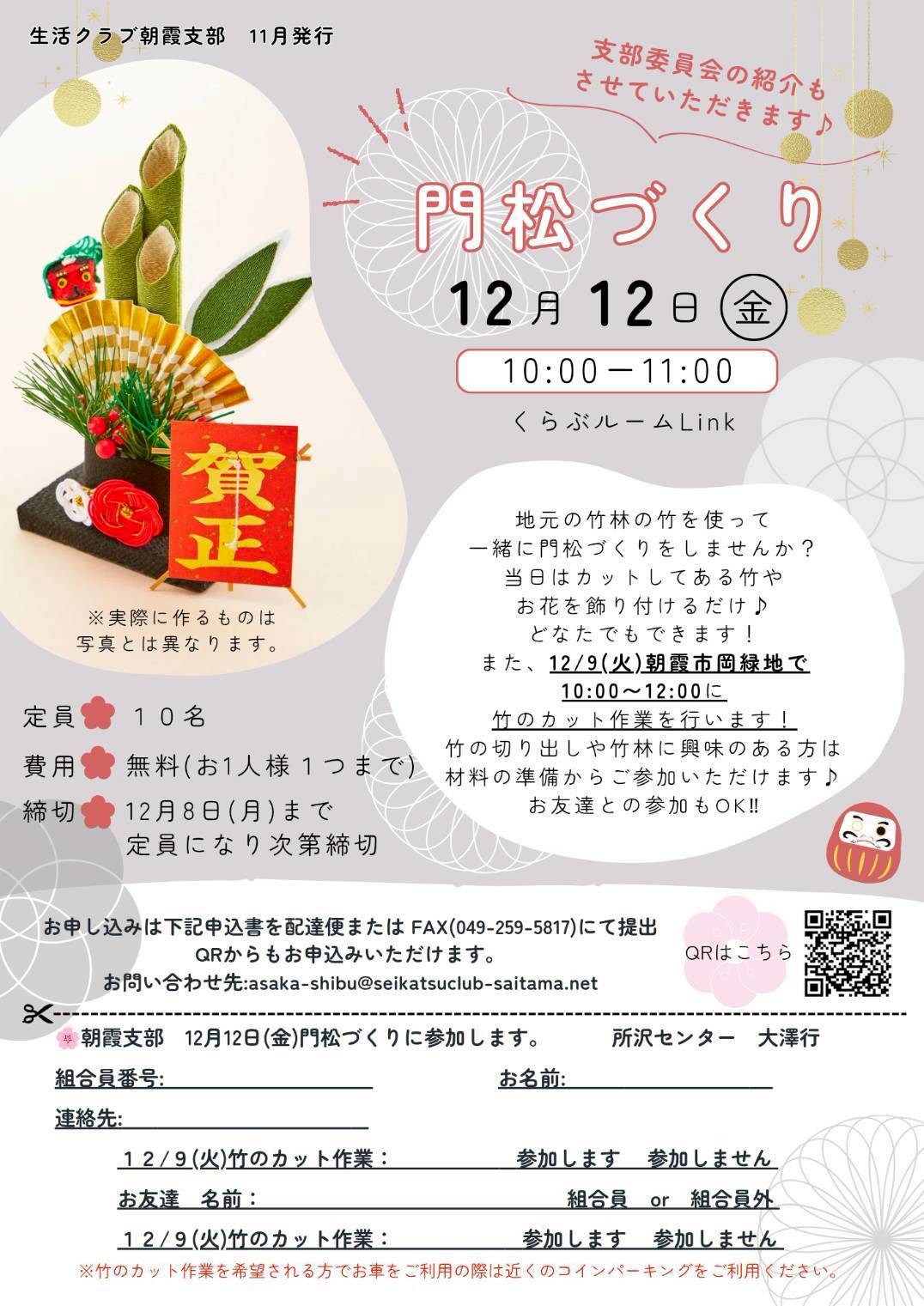 また12/9(火)朝霞市岡緑地で10:00〜12:00の竹のカット作業を行います。