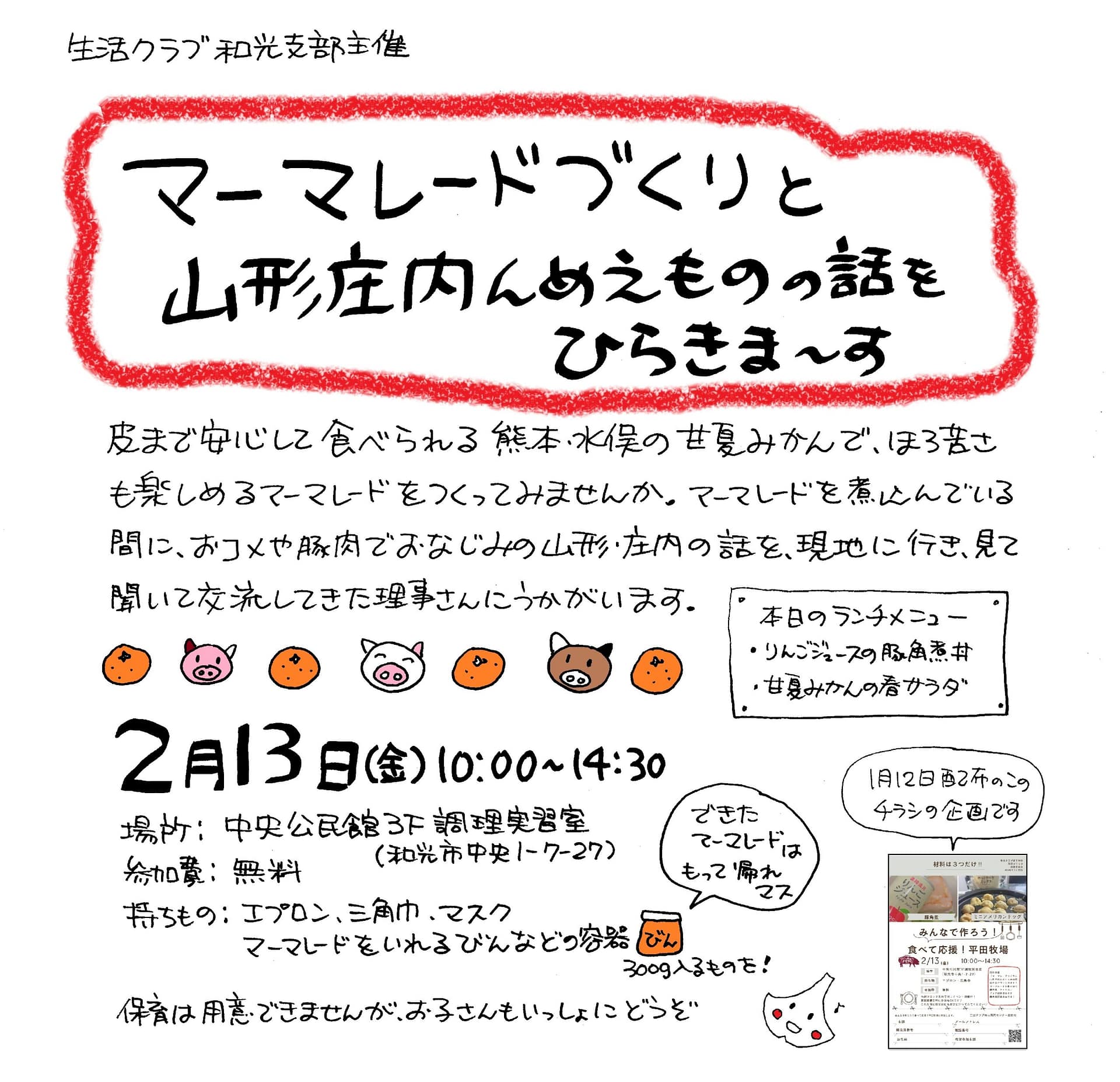 熊本・水俣の甘夏みかんでマーマレードをつくってみませんか。マーマレードを煮込んでいる間に、おコメや豚肉でおなじみの山形・庄内の話を現地に行って見聞きしてきた理事さんに伺います。お昼はおいしい豚角煮丼と甘夏サラダで♪