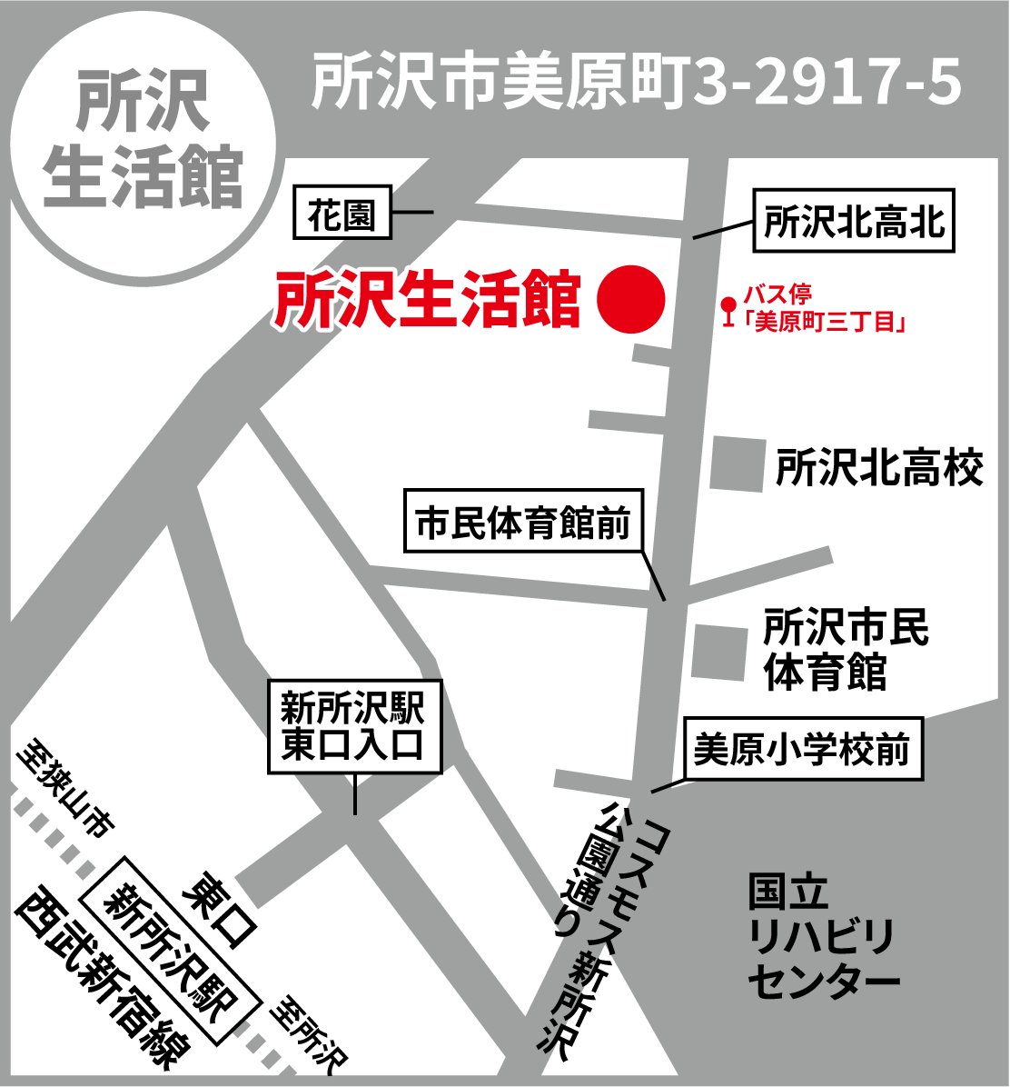 西武新宿線新所沢駅から「所沢ニュータウン行」または「本川越行」のバスで3つめの停留所「美原町三丁目」を降りて目の前にあります!